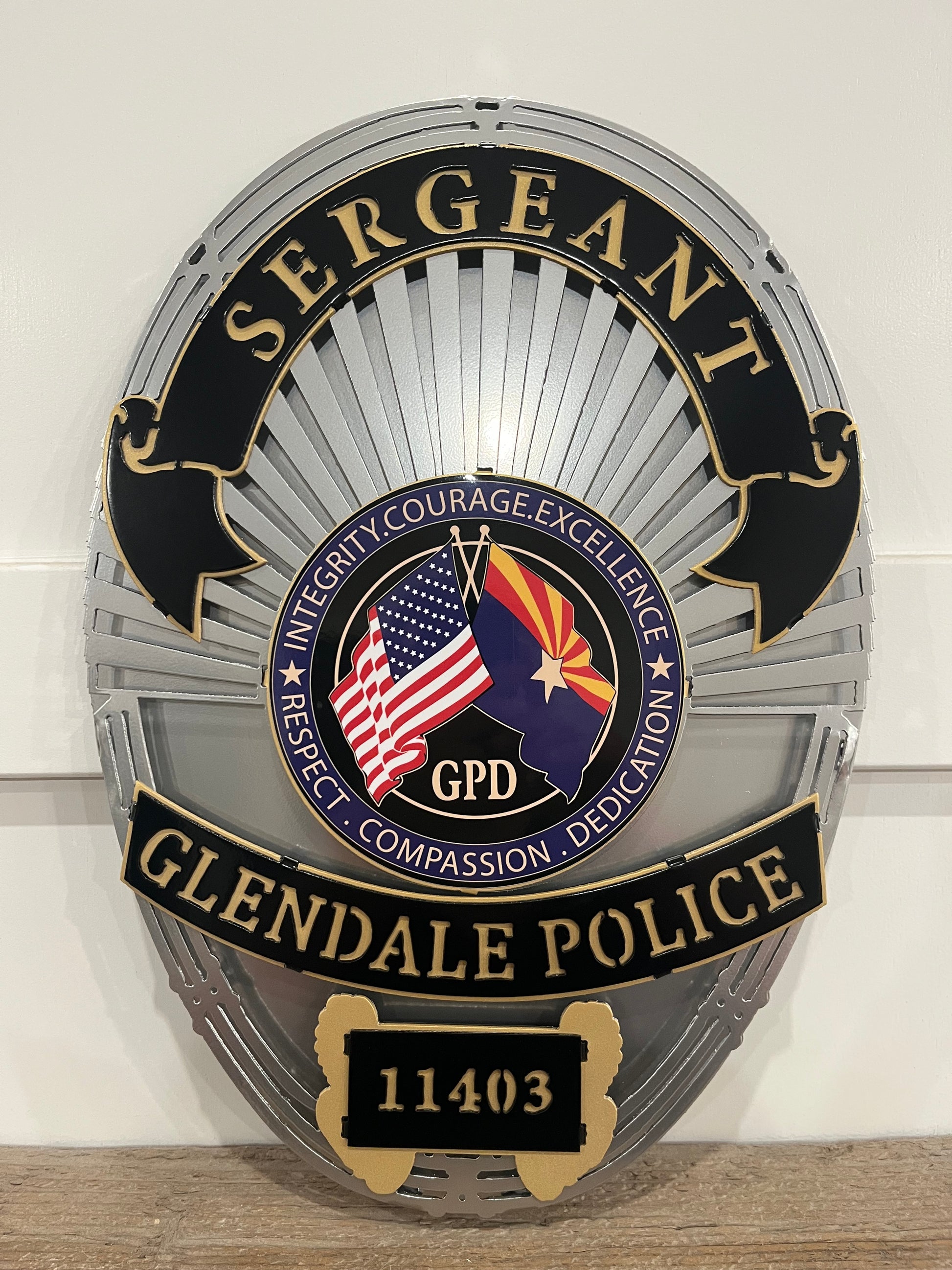 Show your pride and support for Glendale PD! This sign is sure to stun all those who see it in your home or office. Fully customizable with ID number and rank.